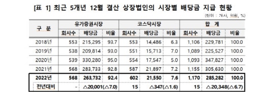 코스피시장 법인 568개사는 26조 3732억원으로 전년대비 7.0% 감소한 금액을, 코스닥시장 법인 602개사는 2조 1550억원으로 전년대비 1.6% 감소한 금액을 지급했다.