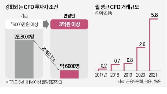 CFD 공급자금을 증권사 신용공여 한도에 포함시키기로 했다. 그동안 증권사들은 별다른 규제를 받지 않아 경쟁적으로 CFD 영업을 늘려왔다. CFD의 월평균 거래금액은 2019년 9000억원, 2020년 2조6000억원을 거쳐 2021년에는 5조8000억원으로 불었다.