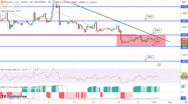 현재 비트코인은 29,500달러 저항선을 밑돌고 있다. 이 저항선은 4시간 차트에서 나타나는 하향 추세선에 의해 강화된다.