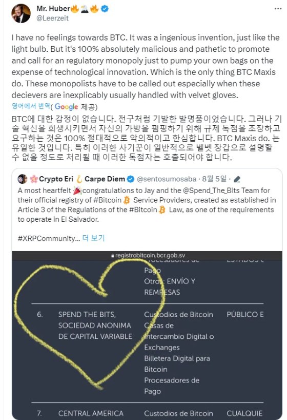“비트코인 맥시멀리스트 악의적이고 한심”–허버, 엘살바도르 리플 원장 BTC 사업 승인 소개하며 비난