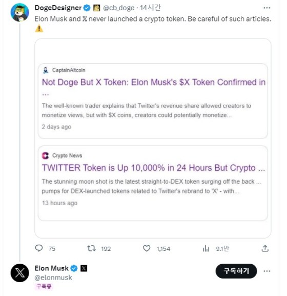 그는 도지코인 관계자(DogeDesigner)가 X가 도지코인이 아닌 자체 토큰을 만든다는 보도를 공유하며 “일론 머스크와 X는 그런 암호 토큰을 절대 만들지 않았다”는 트윗에 긍정적으로 답변했다.