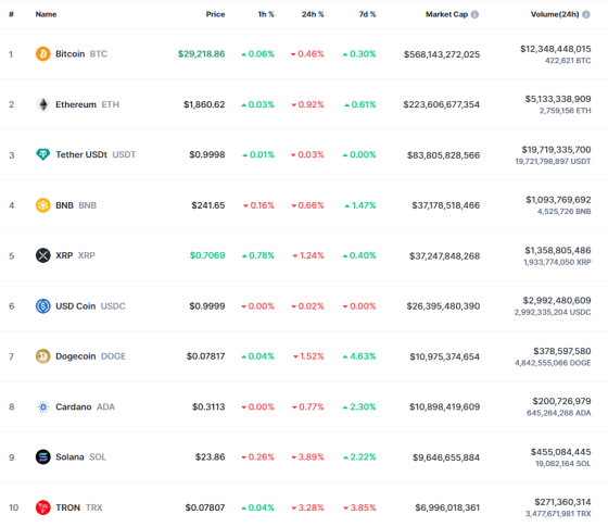 비트코인은 전날 밤과 이날 장 초반 2만9400 달러 위에서 거래가 이뤄지기도 했지만 뉴욕 시간대 전체적으로 활력 없는 모습을 연출했다. 비트코인은 지난 6주간 2만9000 달러 ~ 3만1500 달러 범위에 갇혀 있다. 뉴욕 시간 오후 3시 45분 비트코인은 2만9218.86 달러로 0.46% 내렸다. 같은 시간 이더리움은 0.92% 하락, 1860.62 달러를 가리켰다. XRP, BNB, 도지코인 등 주요 코인들도 소폭 하락하며 조정을 받는 모습이다. 솔라나가 약 4% 하락, 비교적 큰 낙폭을 기록했다.