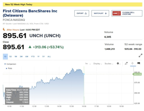 지난 일요일 연방예금보험공사(FDIC )는 뱅크런 사태로 국유화된 실리콘밸리은행(SVB )을 퍼스트시티즌은행에 매각하기로 했다고 발표했다. 이날 퍼스트시티즌은 개장과 함께 주가가 치솟아 하루 만에 53.74% 상승해 거래를 마쳤다.