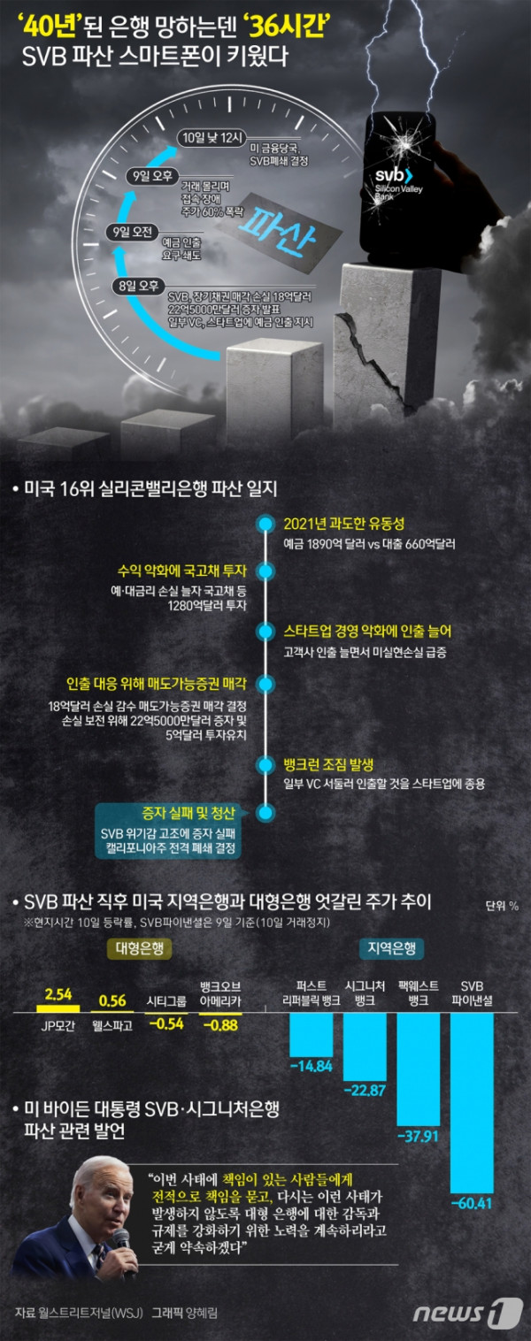 은행 위기 해소 이후엔 (서울=뉴스1) 양혜림 디자이너 = 실리콘밸리가 만든 편리한 IT 세상이 실리콘밸리은행(SVB )을 망하게 하는 데 일조했다고 월스트리트저널(WSJ )이 12일(현지시간) 분석했다. 스마트폰을 켜기만 하면 은행과, 전 세계와 연결되기에 세우고 키우는 데 40년 걸린 은행을 거꾸러뜨리는 데 불과 36시간이 걸렸다는 것이다. Copyright (C) 뉴스1. All rights reserved . 무단 전재 및 재배포 금지.