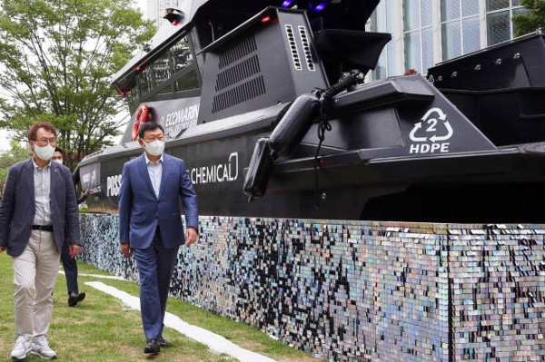 2022년 5월 롯데케미칼 ‘에브리 스텝 포 그린(Every Step for Green)’ 전시를 찾은 신동빈 회장이 100% 재활용이 가능한 자체개발 HDPE 소재로 제작한 ‘가능성(Possibility)’호를 살펴보고 있다. [롯데지주 제공]