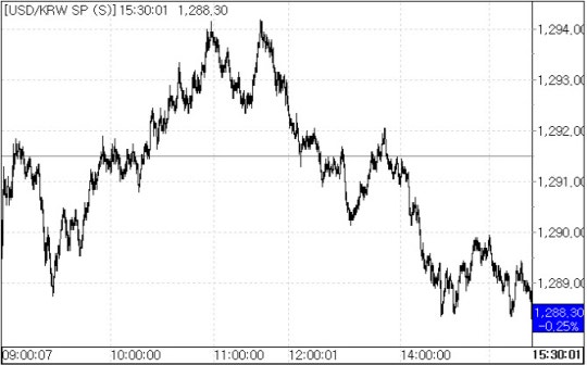 이날 환율은 역외 환율을 반영해 전 거래일 종가에서 1.5원 내린 1290.0원에 개장했다. 이후 오전 9시 20분께 1280원 후반대로 내렸다가 상승 전환해 1294.2원까지 오른 뒤 개장가에서 움직이다가 오후 2시께부터 급락해 1290원 밑에서 마감됐다.