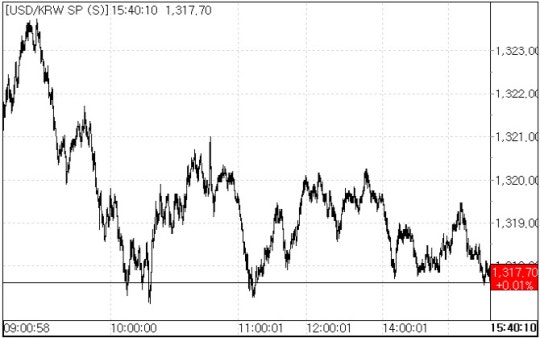 이날 환율은 역외 환율을 반영해 전 거래일 종가에서 4.3원 오른 1321.9원에 개장했다. 이후 1323.7원까지 오른 뒤 상승폭을 줄여 1310원 후반대에서 움직였다.