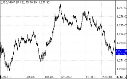 이날 환율은 역외 환율을 반영해 전 거래일 종가에서 9.0원 내린 1271.5원에 개장했다. 이후 1269.6원까지 내린 뒤 낙폭을 반납해 오전 11시를 기점으로 1270원 후반대까지 올랐다가 오후 들어 재차 낙폭을 키워 1270원 초반대에서 마감됐다.