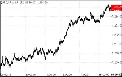 이날 환율은 역외 환율을 반영해 전 거래일 종가에서 3.6원 떨어진 1288.4원에 개장했다. 이후 추세적으로 우상향하면서 오후 3시24분께 1295.2원까지 오른 뒤 소폭 내려 마감됐다.