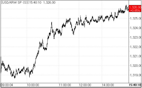 25일 서울외국환중개에 따르면 이날 환율은 전 거래일 종가(1317.4원)보다 8.6원 오른 1326.0원에 거래를 마쳤다. 2거래일 연속 상승세다.