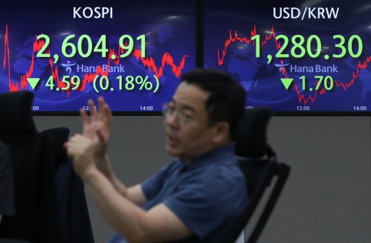 20일 오후 서울 중구 하나은행 명동점 딜링룸 전광판에 코스피 지수가 전 거래일 대비 4.59포인트(0.18%) 내린 2604.91을 나타내고 있다./뉴스1