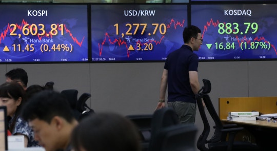 27일 오후 서울 중구 하나은행 명동점 딜링룸에서 종가가 표시되고 있다./뉴스1