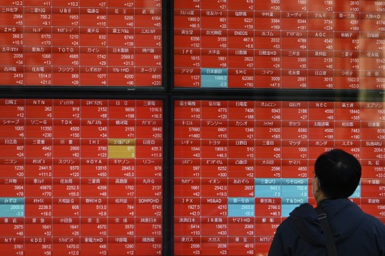 1월 18일(현지시간) 일본 도쿄에서 한 남성이 주가가 표시된 전광판을 들여다보고 있다./AFPBBNews=뉴스1
