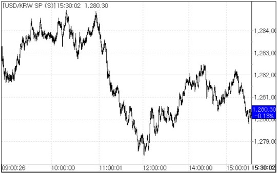 이날 환율은 역외 환율을 반영해 전 거래일 종가에서 1.0원 오른 1283.0원에 개장했다. 이후 오전 10시17분께 1285.0원까지 오르더니 오전 11시께부터 급락해 1278.3원까지 내렸다. 그후 다시 상승 전환해 1280원 초반대에서 움직이다 마감됐다.