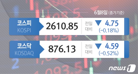 8일 코스피는 전날 대비 4.75p(0.18%) 하락한 2610.85를 가리키고 있다. 이날 코스피는 장중 2595선까지 내리면서 2600선이 무너졌지만 오후 들어 반등하며 하락폭을 줄였다.