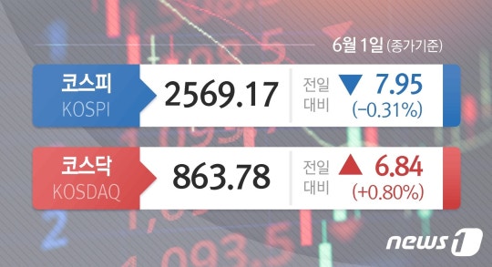 1일 코스피는 전날 대비 7.95p(0.31%) 하락한 2569.17에 장을 마감했다.