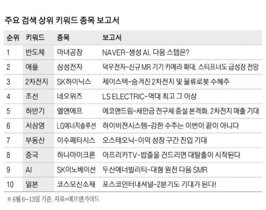 금융정보 업체 에프앤가이드에 따르면 이달 6일부터 13일까지 투자자들이 가장 많이 검색한 키워드 1위는 반도체였다. 가장 많이 검색한 종목에도 삼성전자와 SK하이닉스가 나란히 2위와 3위를 차지했다.