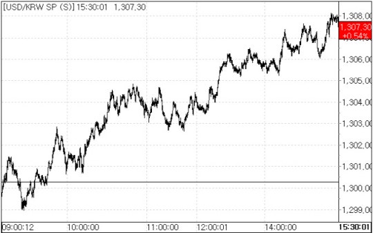28일 서울외국환중개에 따르면 이날 환율은 전 거래일 종가(1300.3원)보다 7.0원 오른 1307.3원에 거래를 마쳤다. 하루 만의 상승 전환이다.