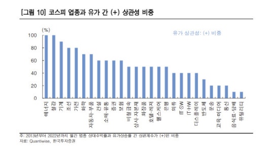 김 연구원은 “주식 측면에서 유가 상승은 다양한 결과를 야기한다”며 “지금처럼 중앙은행의 물가 경계심이 높을 때는 금리 상승을 간접적으로 자극하며, 금리에 민감한 고밸류 종목은 다소 쉬어갈 여지가 있다”고 설명했다. 그는 “반면 유가 상승이 기업 실적에 호재로 작용하는 경우도 존재한다”며 “정유와 같은 에너지 기업과 유가 상승으로 설비 투자가 늘어날 수 있는 기계, 조선 등”이라고 밝혔다.