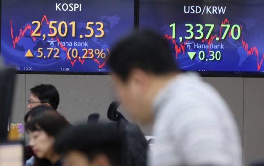 코스피가 강보합권에서 마감하며 2,500선을 기록한 4월 28일 오후 서울 중구 하나은행 딜링룸 스크린에 지수가 띄워져 있다. 연합뉴스