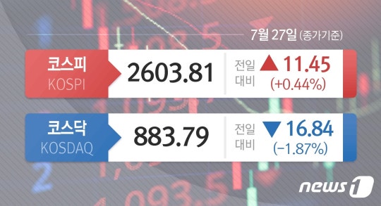 이날 코스피는 전날 대비 11.45p(0.44%) 상승한 2603.81에 마감했다. 외국인은 790억원, 기관은 4374억원 각각 순매수했다. 개인은 5056억원 순매도했다.
