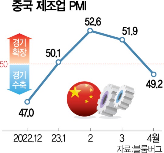 중국 국가통계국은 30일 4월 제조업 PMI가 49.2라고 밝혔다. 블룸버그통신 등은 이를 보도하며 3월의 51.9는 물론 시장 예상치(51.4)도 크게 밑돌았다고 전했다. 기업 구매 담당자를 대상으로 조사하는 PMI는 50을 웃돌면 경기 확장, 밑돌면 경기 수축을 의미한다.