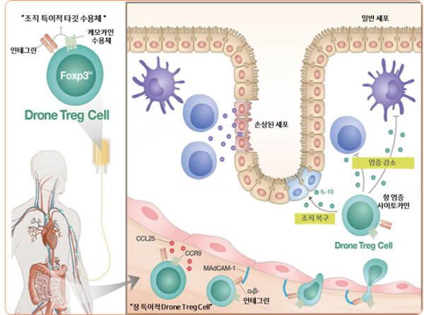 드론티렉은 드론처럼 표적 장기를 정확하게 조준하는 환자 맞춤형 T세포 치료제다. 장 점막 타깃 수용체를 잘 발견하고, 항염증성 사이토카인을 다량 분비하는 것이 차별점이라는 것이 회사 측 설명이다.