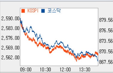 마켓포인트에 따르면 이날 코스닥 지수는 전거래일보다 7.17포인트(0.82%) 하락한 866.97에 거래를 마쳤다. 이날 코스닥 지수는 870선에서 출발했다.