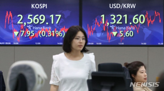 1일 코스피는 전 거래일(2577.12)보다 7.95포인트(0.31%) 하락한 2569.17에 장을 닫았다. 이날 코스피는 0.18% 내린 2572.56에 출발해 한때 상승 전환하기도 했다. 하지만 이내 반락했고 하락 폭이 점점 커졌다.