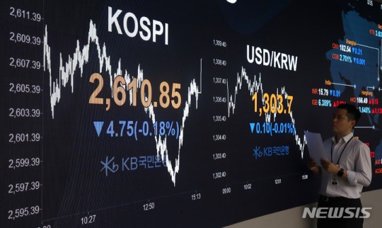 이날 코스피는 전 거래일 대비 6.39포인트(0.24%) 내린 2609.21에 출발했으나 점점 하락 폭이 확대되는 모습이 나타났다. 특히 오후 들어 장중 한때 2600선 아래로 내려가기도 했다. 하지만 달러 인덱스가 하락하면서 원·달러 환율이 올라 외국인의 매도세가 약화됐고, 하락 폭이 둔화됐다.