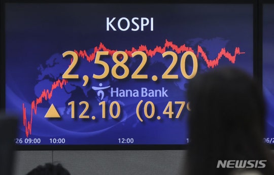 26일 코스피는 전거래일 대비 12.10포인트(0.47%) 오른 2582.20에 장을 마쳤다. 이날 1.45포인트 하락 출발한 지수는 장 초반 약보합권을 맴돌았지만 개장 후 25분여만에 상승 전환한 뒤 안정적인 흐름을 이어갔다.