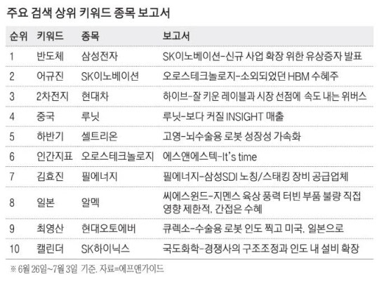 지난 한 주간 투자자들은 유상증자를 발표한 SK이노베이션에 큰 관심을 보인 것으로 나타났다. 고대역폭 메모리(HBM) 수혜주 등 반도체 업종에도 이목이 집중됐다.