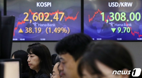 3일 오후 서울 중구 하나은행 딜링룸 전광판에 코스피 지수가 전거래일 대비 38.19p(1.49%) 상승한 2602.47을 나타내고 있다. 이날 코스닥 지수는 전 거래일보다 21.05p(2.42%) 상승한 889.29으로, 원·달러 환율은 전 거래일보다 9.7원 내린 1308.0원으로 거래를 마쳤다. 2023.7.3/뉴스1 ⓒ News1 박지혜 기자
