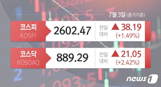 3일 코스피는 전날 대비 38.19p(1.49%) 상승한 2602.47에 장을 마감했다. 코스피가 종가 기준 2600선을 회복한 것은 지난 6월20일(2604.91) 이후 9거래일만이다.